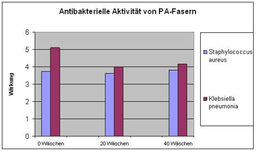 Antimikrobielle Wirksamkeit von PA-Faser nach 40 WäschenWirkung: 0-1 gering, 1-3 signifikant, 3-5 starkPA-Faser mit 1,5% TROVO®guard